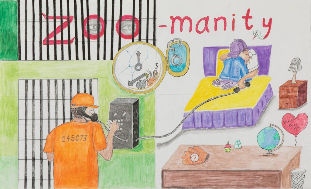 Zoo-Manity is a drawing of a male prisoner that represents the sheer number of males incarcerated and ending up as examples they don’t want their kids to model.